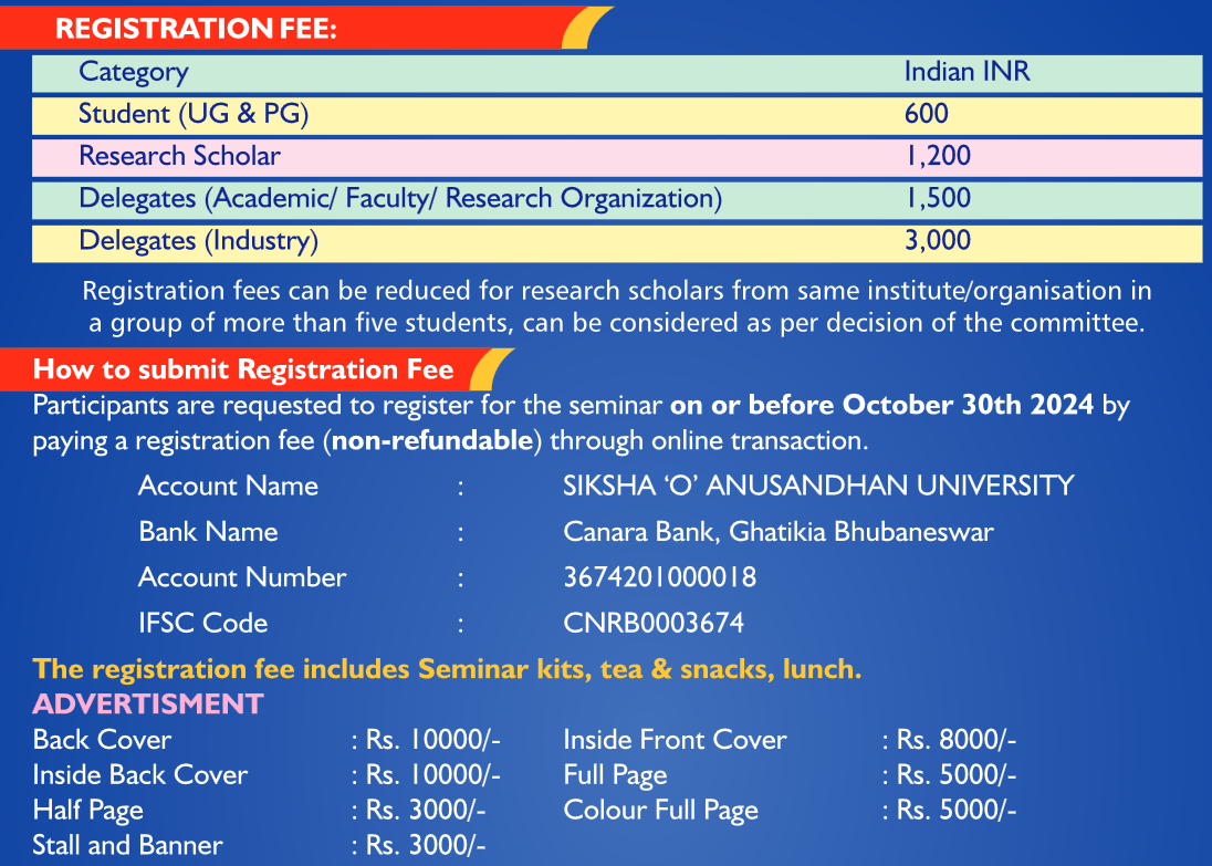 The Seminar will comprise invited talks, oral presentations, poster presentations, and exhibition. The schedule of the presentation and other updates will be provided on the seminar's website (www.sadcss.soa.ac.in). Acceptance of the abstract requires registration in the seminar with payment of the requisite fee for attending the seminar.